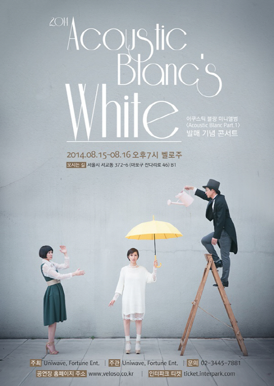 가수 박기영, 기타리스트 이준호, 베이시스트 박영신으로 구성된 밴드 어쿠스틱 블랑(Acoustic Blanc)이 15일 밴드 결성 후 처음으로 공연 '어쿠스틱 블랑 화이트(Acoustic Blanc White)'를 개최한다.
