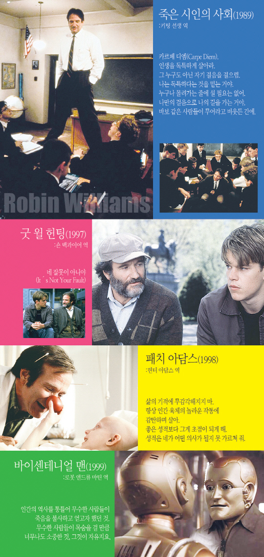 오 캡틴, 마이 캡틴(Oh Captain, My Captain). 우리들의 영원한 키팅 선생님, 로빈 윌리엄스가 세상을 떠났습니다. 그의 영화는, 그리고 그의 연기는 많은 사람들에게 치유와 평안을 안겨 주었습니다. 위대한 배우 로빈 윌리엄스를 추억하며…. 영화 속 명대사들을 통해 로빈 윌리엄스가 남긴 흔적을 돌아봤습니다.