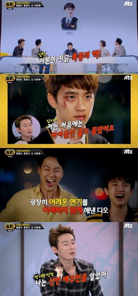 이날 박지윤은 "'괜찮아 사랑이야'에서 엑소의 디오 연기는 어떻게 봤느냐"고 물었고, 허지웅은 "이 분이 지금 폭풍의 핵이다. 나는 처음에 디오 씨가 아이돌인 줄 몰랐다"며 "조인성 씨와 달리면서 웃다가 우는 장면이 있는데 말로 표현해서 쉽지 정말 연기하기 어려운 장면인데 잘해줬다"고 칭찬했다.
