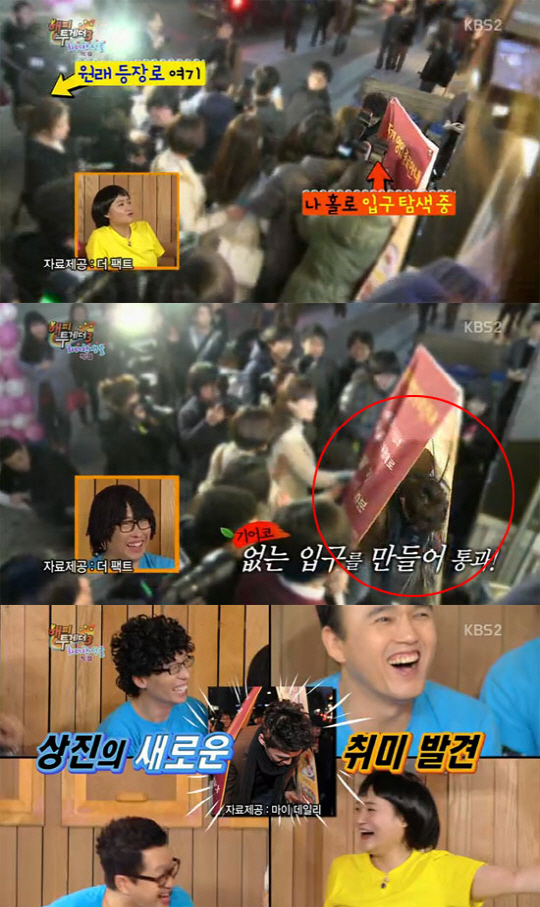 수많은 취재진에 당황한 모습으로 차에서 내린 오상진이 입구를 찾지 못하고 헤매다 입간판 사이를 통과하는 엉뚱한 매력을 보였다.