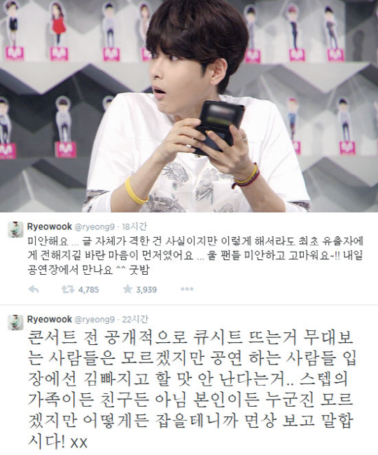 하지만 이후 트위터에 다시 글을 게재한 려욱은 "미안해요. 글 자체가 격한 건 사실이지만 이렇게 해서라도 최초 유출자에게 전해지길 바란 마음이 먼저였어요. 울 팬들 미안하고 고마워요! 내일 공연장에서 만나요"라는 글을 남겨 팬들을 위로했다.