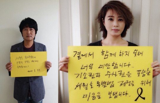 또 '놈놈놈' '달콤한 거짓말'의 김지운 감독은 "유가족이 동의하는 세월호 특별법이 정답입니다"라며 간명한 뜻을 밝혔고 '범죄와의 전쟁''군도'의 윤종빈 감독은 "안타깝습니다. 원통합니다. 제대로 된 세월호 특별법 간절히 원합니다"라고 했다.
