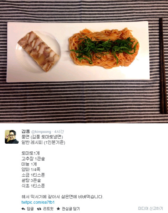 이에 김풍은 자신의 SNS에 직접 레시피를 공개했다. 그는 "'나혼자산다'에 나온 레시피를 알려주겠다"며 "토마토 1개, 고추장 1큰술, 마늘 1개, 양파 1/4쪽, 소금 1티스푼, 설탕 3큰술, 식초 1티스푼해서 믹서기에 갈아서 삶은 면에 비벼먹습니다"라는 글과 함께 토마토 냉면의 사진을 함께 게재했다.