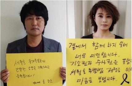 김혜수 역시 "곁에서 함께하지 못해 너무 미안하다. 기소권과 수사권을 포함한 세월호 특별법 제정을 위해 마음을 보탠다"며 세월호 특별법 제정을 촉구하고 나섰다.