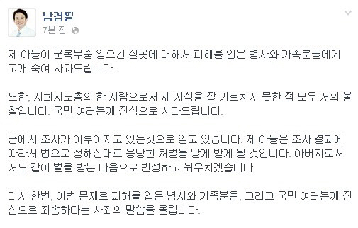남경필 경기도 지사는 17일 오후 자신의 페이스북에 "제 아들이 군 복무 중 일으킨 잘못에 대해서 피해를 입은 병사와 가족분들에게 고개 숙여 사과드립니다"라고 글을 남겼다.