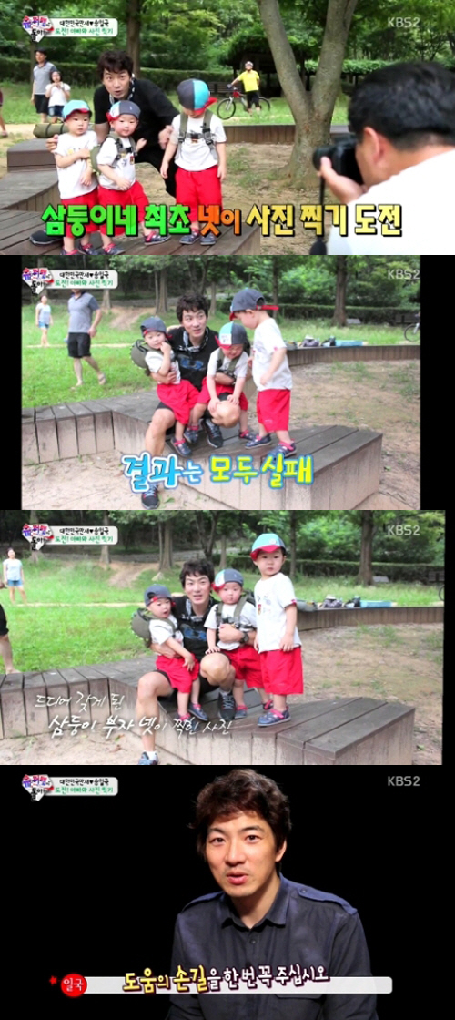 이날 송일국은 세쌍둥이와 수목원 나들이에 나섰다. 각자 뛰어놀기 바쁜 세쌍둥이를 보호하느라 지친 송일국은 잔디밭 쉼터에서 사진 찍기에 도전했다.