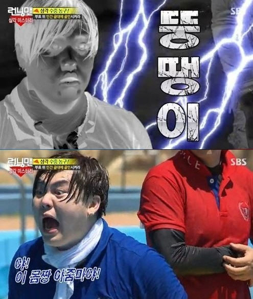 이날 삼각 수중 농구에서 계속되는 팀원들의 실수에 민감해진 김종국은 부표 위에 있는 문희준에게 "내려와 뚱땡이!"라며 화를 냈다. 순간 '뚱땡이'라는 말에 놀란 문희준은 "뭐? 뚱땡이?"라며 눈을 동그랗게 뜨며 놀라했다.