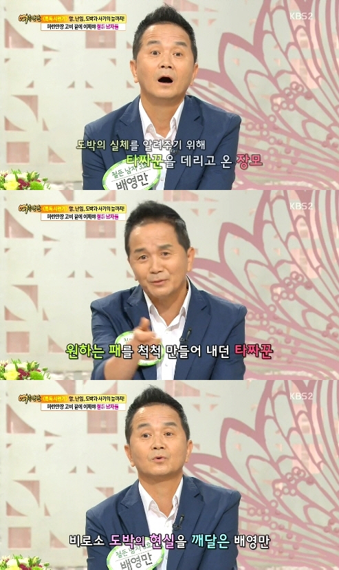 배영만은 "모르는 분은 절대 도박을 하면 안 된다. 당시 타짜가 내가 원하는 모든 패를 다 만들어주더라. 그 장면을 보고 '이거 안되겠다' 느꼈다"고 말했다.