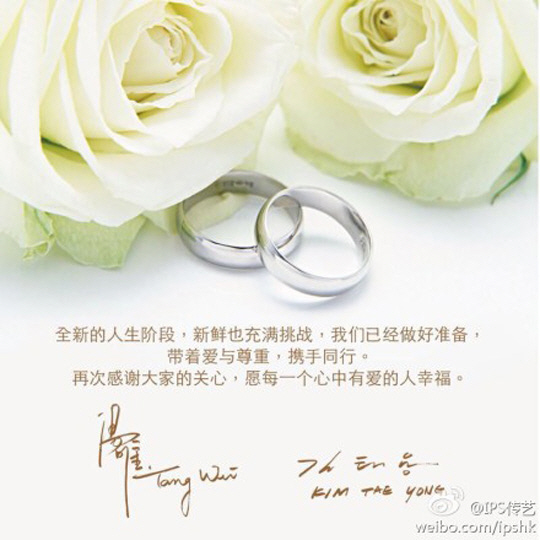 탕웨이 소속사 측은 공식 웨이보 계정을 통해 "여러분들에게 좋은 소식을 전하게 돼 기쁘다"며 "탕웨이와 김태용 감독이 최근 양가 부모와 친지들이 보는데서 결혼식을 올리고 공식적으로 부부가 됐다. 남편과 아내로 새로운 삶을 시작하는 두 사람의 결혼생활이 행복하길 진심으로 바란다"는 글과 함께 청첩장과 웨딩화보 두 장을 공개했다.