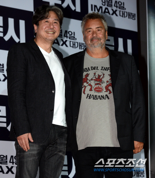 뤽 베송 감독의 영화 '루시'의 언론시사회가 20일 서울 용산 CGV에서 열렸다. 뤽 베송 감독과 최민식이 함께 포즈를 취하고 있다. '루시'는 평범한 삶을 살던 여자 루시(스칼렛 요한슨)가 절대악 미스터 장(최민식)에게 납치돼 이용당하다 우연히 모든 감각이 깨어나게 되면서, 두뇌와 육체를 완벽하게 컨트롤하게 되는 이야기를 그린 영화로 오는 9월 4일 개봉한다. 용산=허상욱 기자 wook@sportschosun.com/2014.08.20/