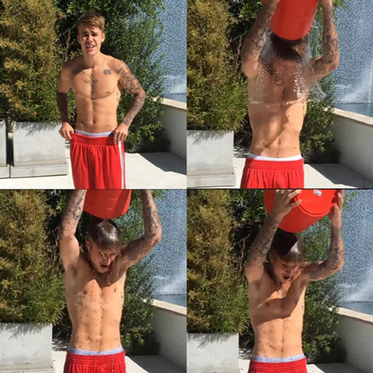 저스틴비버은 최근 자신의 SNS에 아이스버킷챌린지 영상을 공개했다. 공개된 영상에서 저스틴 비버는 상의를 탈의한 채 얼음물이 든 양동이을 자신의 머리위로 들이부었다.