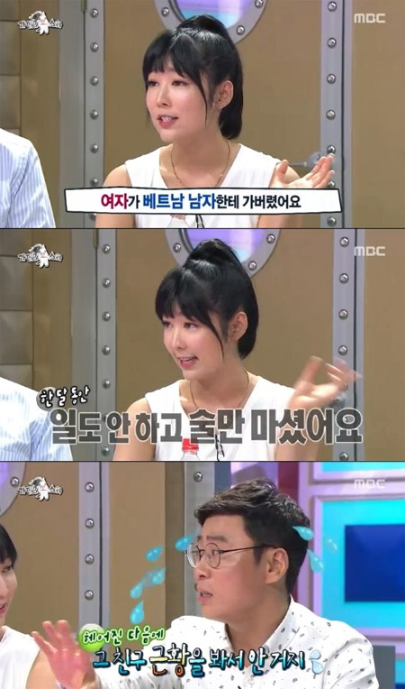 이어 "오랫동안 사귀다 보니까 그 친구가 내 동료들과도 친해졌다. 동료들에게 나중에 넘어 넘어 들은 것이다"고 덧붙였다. 그러나 사유리는 "큰 식당 갖고 있는 베트남 남자였다"고 폭로를 이어나가 웃음을 자아냈다.