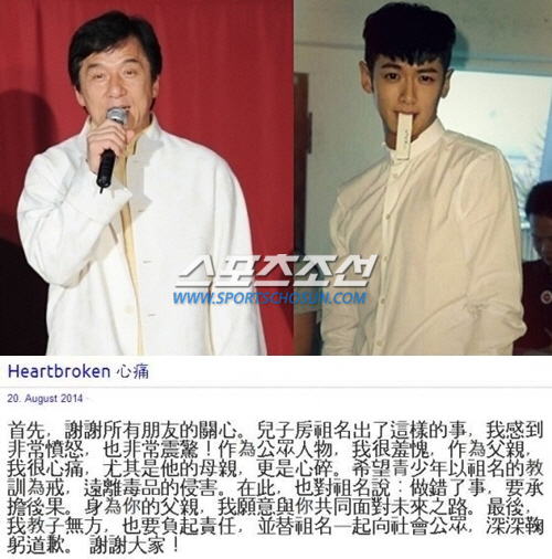 성룡 아들 방조명 마약 복용 혐의에 대한 심경글에 네티즌들은 "