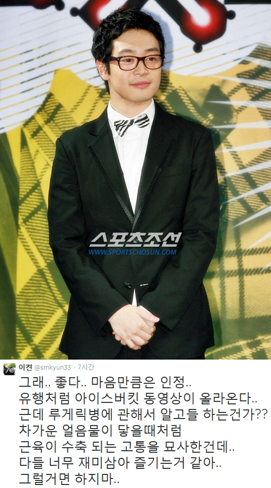 21일 오후 이켠은 자신의 트위터 계정을 통해 "유행처럼 아이스 버킷 동영상이 올라온다. 그 마음은 인정하지만 루게릭병에 관해서 알고 하는건가?"라고 운을 뗐다.