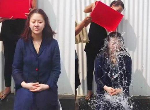사진 속 고현정은 차분한 표정으로 의자에 앉아있는 모습. 이어 김희선이 빨간 양동이를 들고 얼음물을 쏟았고, 고현정은 두 손을 가지런히 모은 채 물을 맞고 있다.