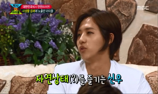 23일 방송된 MBC '세바퀴-박사vs아이돌' 특집에서 MC 박미선의 숙소 안의 사생활이 노출 당한 경험이 있냐라는 질문에 신우는 "옷 입는 것을 좋아하지 않아 숙소에서 팬티까지 벗는다"고 다소 파격적인 대답을 했다.
