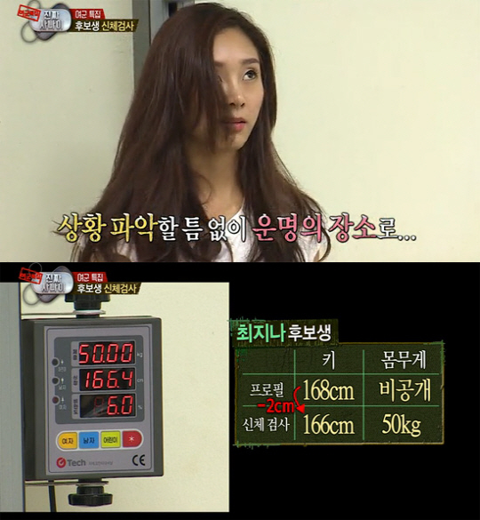 지나는 키 166cm, 몸무게 50kg을 기록했다. 프로필 키 168cm와 2cm 차이가 났다.