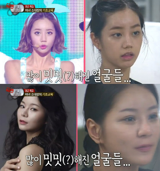 이날 출연진들은 본격적인 훈련에 앞서 화장을 지우는 등 외모 및 복장 정비 시간을 가졌다. 특히 여자 출연자들은 민낯임에도 불구, 수수하고 청순한 매력을 선보였다.