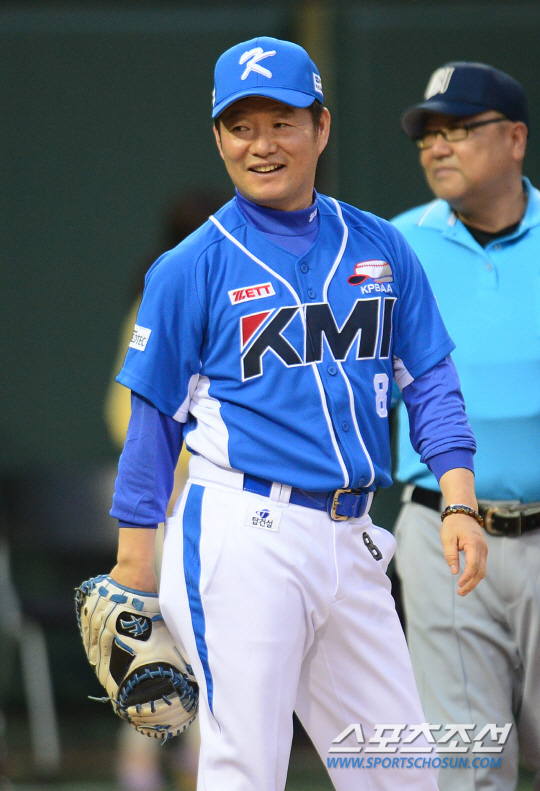연예인 올스타와 프로야구 은퇴선수들이 올스타 자선야구를 열었다. 25일 목동구장에서 '다문화 가정과 넥센 히어로즈가 함께하는 '한은회-연예인 올스타 자선 야구대회'가 열렸다. 선수가 아닌 코치로 나온 이순철 야구해설위원이 공수교대 때 투수의 공을 받아주고 있다. 목동=정재근 기자cjg@sportschosun.com/2014.08.25/