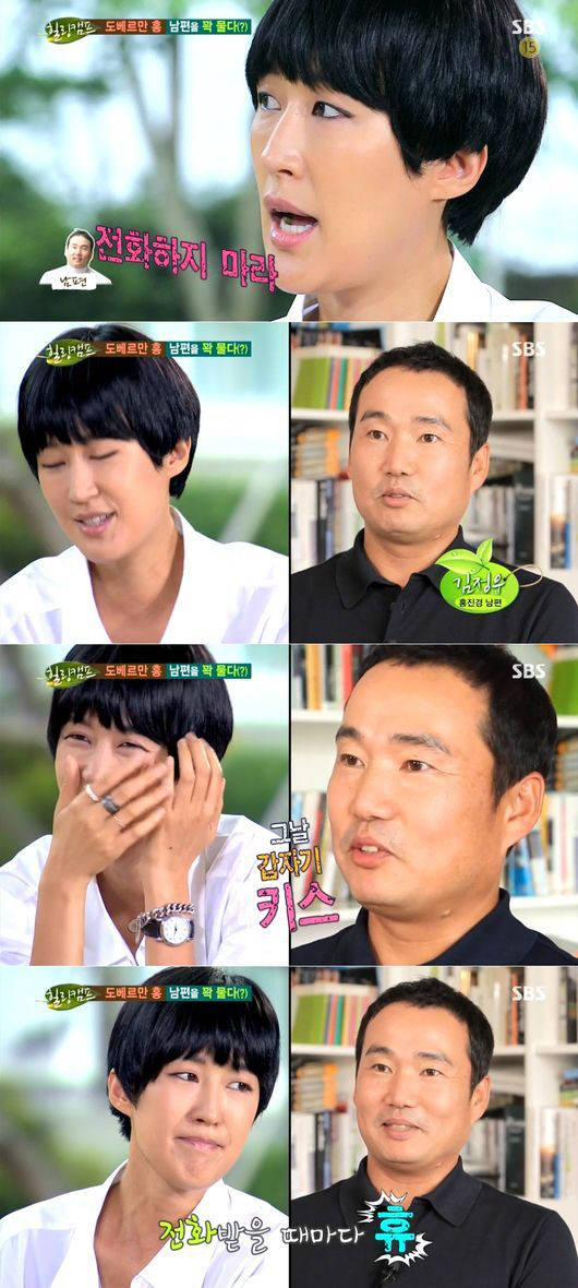 이때 남편이 화면을 통해 등장했다. 홍진경의 남편은 당시를 회상하며 "'그냥 재미있는 사람이겠구나'하고 궁금해 했다"며 "둘 다 술을 좋아하는 편이다. 첫 날 만나자마자 서먹서먹해서 술을 마시기 시작했는데, 진경씨는 매니저가 와야 하니까 매니저가 올 때까지 차에 같이 있자고 했다. 그랬는데 그때 나에게 키스를 했다"고 당시에 대해 설명했다.
