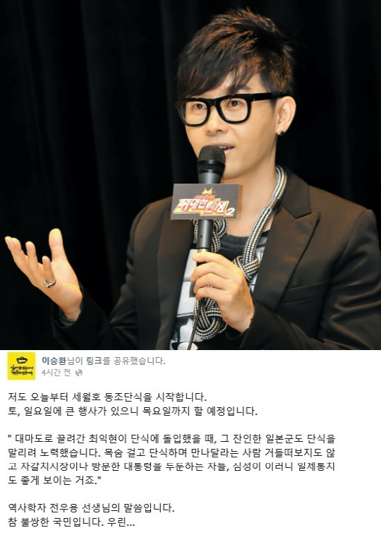 이승환은 "대마도로 끌려간 최익현이 단식에 돌입했을 때 그 잔인한 일본군도 단식을 말리려 노력했습니다. 목숨 걸고 단식하며 만나달라는 사람 거들떠보지도 않고 자갈치시장이나 방문한 대통령을 두둔하는 자들, 심성이 이러니 일제통치도 좋게 보이는거죠"라고 덧붙였다.