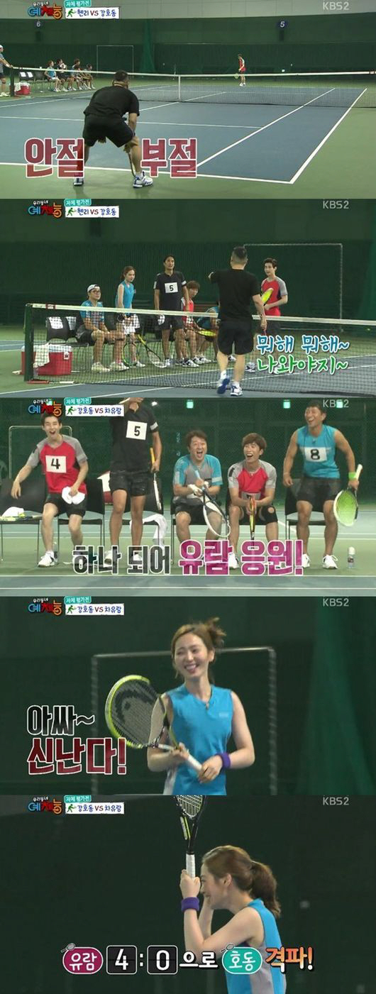 지난주 테니스편 첫 방송에서 '테니스광'임을 자처한 강호동은 이날 자체 평가전에서 헨리를 꺾으며 기세를 올렸다. 이후 강호동은 다음 상대로 차유람을 지목했다.