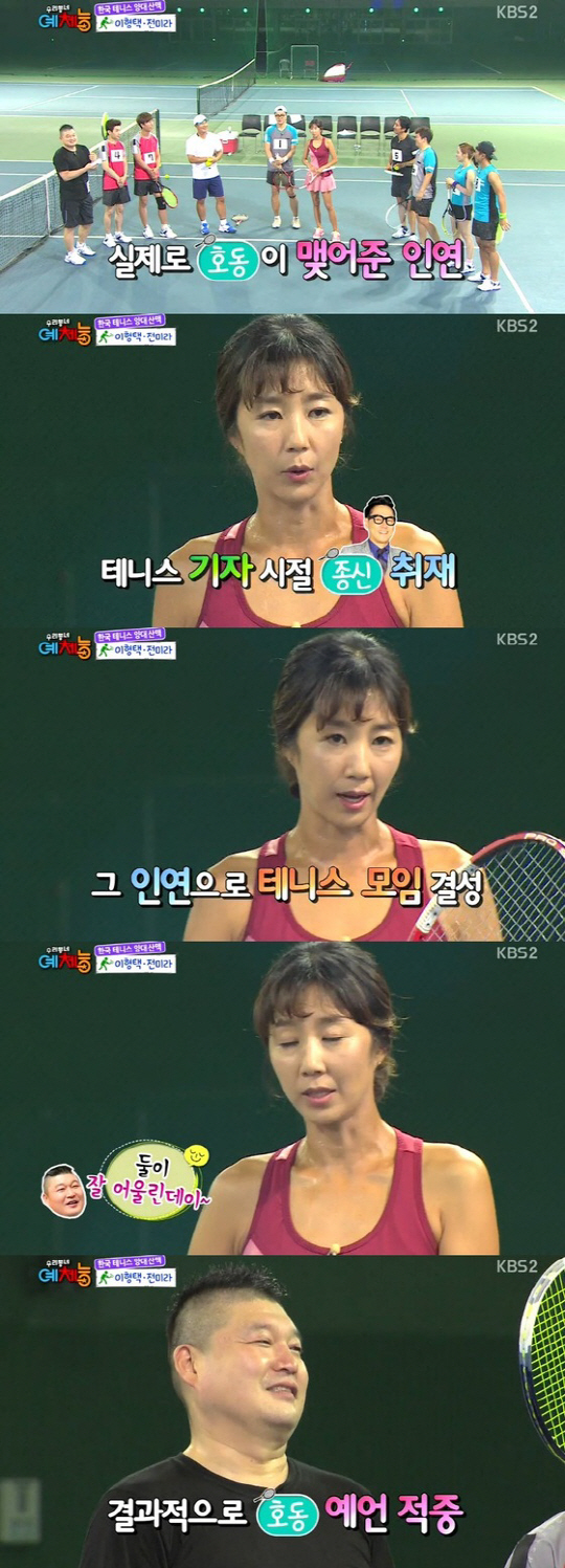 이날 윤종신의 아내이기도한 전미라는 '강호동이 오작교라던데 맞느냐'는 멤버들의 질문에 "사실이다. 테니스기자 시절 윤종신을 취재한 적이 있는데, 그때 모임을 만들자는 얘기가 나와 모임을 가졌다"고 운을 뗐다.