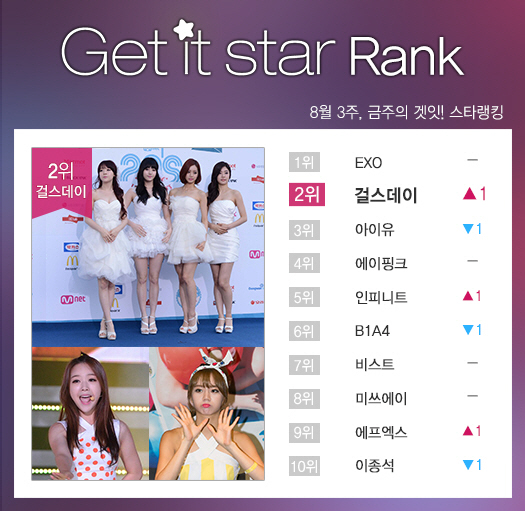 겟잇스타 랭킹 2014년 8월 3주차에서 순위 변동이 있었네요. 여전히 EXO가 선두를 수성 중인 가운데, 걸스데이가 아이유를 3위로 끌어내리고, 2위를 꿰차는 작은 변화가 있었습니다.