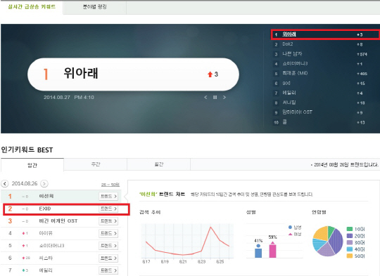 걸그룹 EXID가 27일 새 싱글 '위아래' 발매 이후 각종 음악 사이트에서 뜨거운 사랑을 받고 있다.