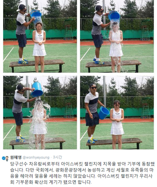 원혜영 의원은 "당구선수 차유람 씨로부터 아이스 버킷 챌린지에 지목을 받아 기부에 동참했습니다. 다만 국회에서, 광화문광장에서 농성하고 계신 세월호 유족들의 마음을 헤아려 얼음물 세례는 하지 않았습니다. 아이스 버킷 챌린지가 우리 사회 기부문화 확산의 계기가 됐으면 합니다"라는 글을 올렸다.