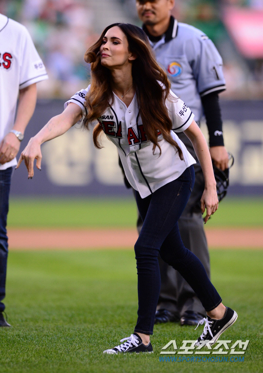 이날 두산 베어스 유니폼을 입은 채 청바지를 매치한 완벽한 시구 패션을 선보인 메간 폭스가 마운드에 들어서자 관중들은 우렁찬 함성과 박수로 환영했다.