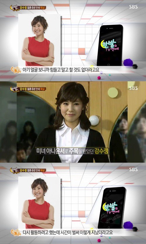 27일 방송된 SBS '한밤의 TV연예'에서는 최근 결혼 6년만에 아들을 얻은 강수정과의 전화 인터뷰 내용이 전파를 탔다.