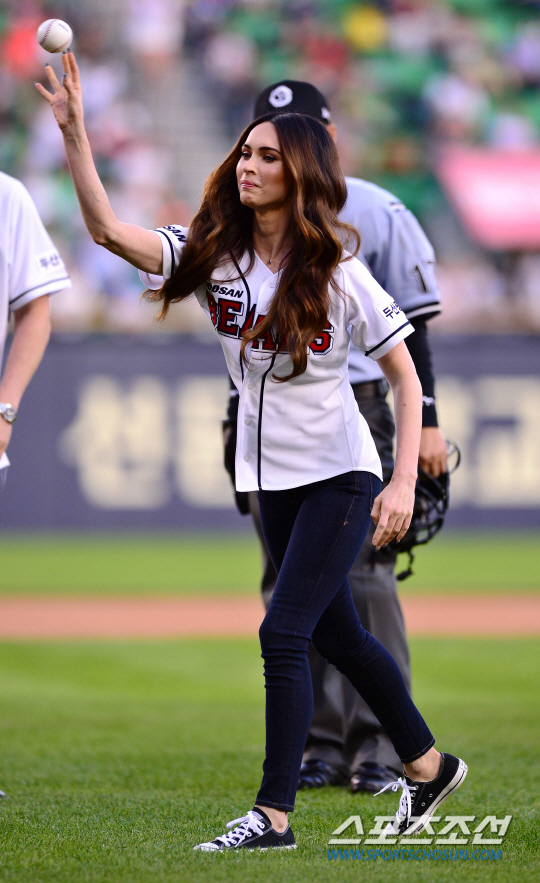 이날 두산 베어스 유니폼을 입은 채 청바지를 매치한 완벽한 시구 패션을 선보인 메간 폭스가 마운드에 들어서자 관중들은 우렁찬 함성과 박수로 환영했다.