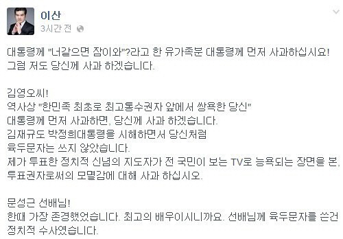이어 이산은 "김영오 씨! 역사상 한민족 최초로 최고통수권자 앞에서 상욕한 당신, 대통령께 먼저 사과하면 당신께 사과 하겠습니다. 김재규도 박정희 대통령을 시해하면서 당신처럼 육두문자는 쓰지 않았습니다"라고 주장했다.