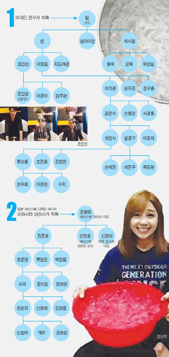 아이스버킷 챌린지가 국내에 상륙한지 열흘도 채 안 돼 연예계, 스포츠계, 정계, 재계를 휩쓸었습니다. 다음 주자로 지목할 사람이 과연 남아 있긴 한 걸까 싶을 정도로 각계각층의 수많은 사람들이 이 캠페인에 동참했는데요. 한국에서는 가수 팀과 페이스코리아 조용범 대표가 '문익점' 역할을 했습니다. 거미줄처럼 뻗어나가는 얼음물 샤워 릴레이를 그림으로 정리해 봤습니다. 마치 '다단계 피라미드' 같군요. 그래도 이런 다단계라면 행복할 것 같아요. 여러분도 얼음물 한 바가지 하실래요?
