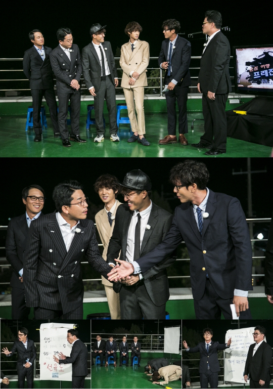 무엇보다 하루 종일 땀을 뻘뻘 흘린 멤버들은 PT에 앞서 예의를 갖추기 위해 모두 수트로 갈아입어 '환골탈태' 한 모습으로 만났는데, 서로 각자 다른 팀으로 만나 경쟁을 펼치게 된 3G 김주혁-김준호-김종민은 멀끔한 모습에 서로를 훑어보며 머쓱해 했고, 이를 극복하기 위해 '악수'를 나눠 현장을 웃음바다로 만들었다.