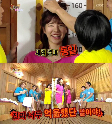 측정 결과, 써니의 키는 온라인 포털사이트에 등록된 프로필 그대로 158cm. 이에 써니는 기뻐하며 "그동안 너무 억울했다. 인터넷을 봤는데 네티즌들이 나를 155㎝인줄 알더라"고 토로해 웃음을 자아냈다.