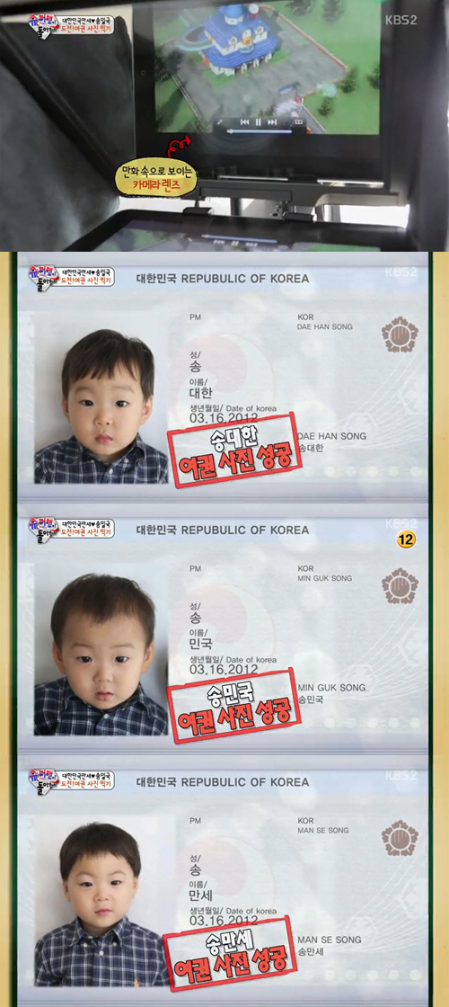 이에 송일국은 세 쌍둥이의 시선을 단숨에 사로잡는 장비를 갖추고 다시 촬영에 돌입했다. 카메라 렌즈 앞에 거울과 태블릿 PC를 설치한 송일국은 만화를 틀어 세 쌍둥이가 집중할 수 있게 만든 후 여권 사진 찍기에 성공했다.