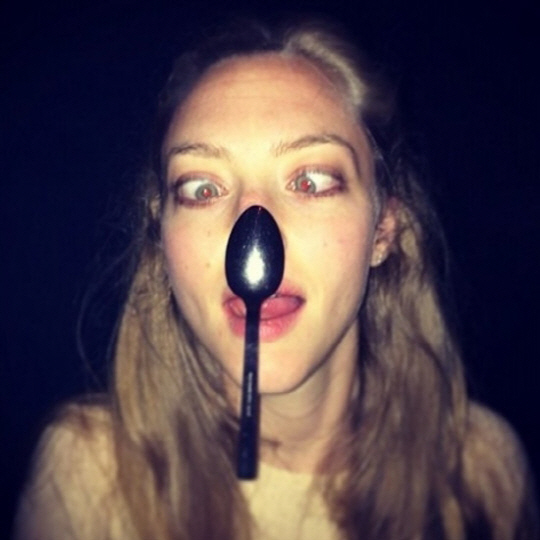 아만다 사이프리드는 숟가락을 코에 붙인 채 양 쪽 눈동자를 가운데로 모은 엽기적인 표정을 짓고 있다.