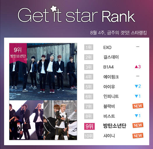 겟잇스타 랭킹 2014년 8월 4주차는 남자 아이돌 그룹들이 다시 힘을 내 순위권을 장악한 한 주였습니다. 인피니트, 블락비, 비스트, 방탄소년단, 샤이니 등 잠시 순위권에서 벗어났던 그룹들이 모두 TOP 10에 진입했는데요. 그중에서도 방탄소년단의 급상승한 인기가 눈길을 끌고 있습니다.