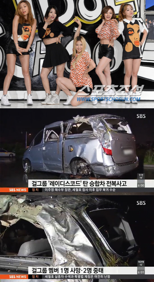 이날 오전 1시 23분쯤 경기 용인시 영동고속도로 인천 방향 43km 지점 신갈분기점 부근에서 5인조 '레이디스코드(LADIES' CODE)' 멤버들이 탄 승합차가 빗길에 미끄러져 갓길 방호벽을 들이받았다.