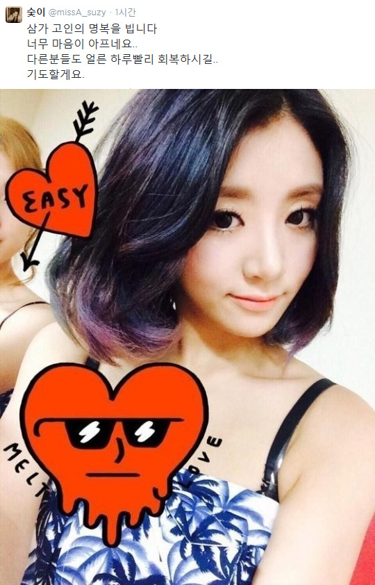 수지는 3일 자신의 트위터에 "삼가 고인의 명복을 빕니다. 너무 마음이 아프네요"며 은비의 사망 소식에 애도를 표했다.