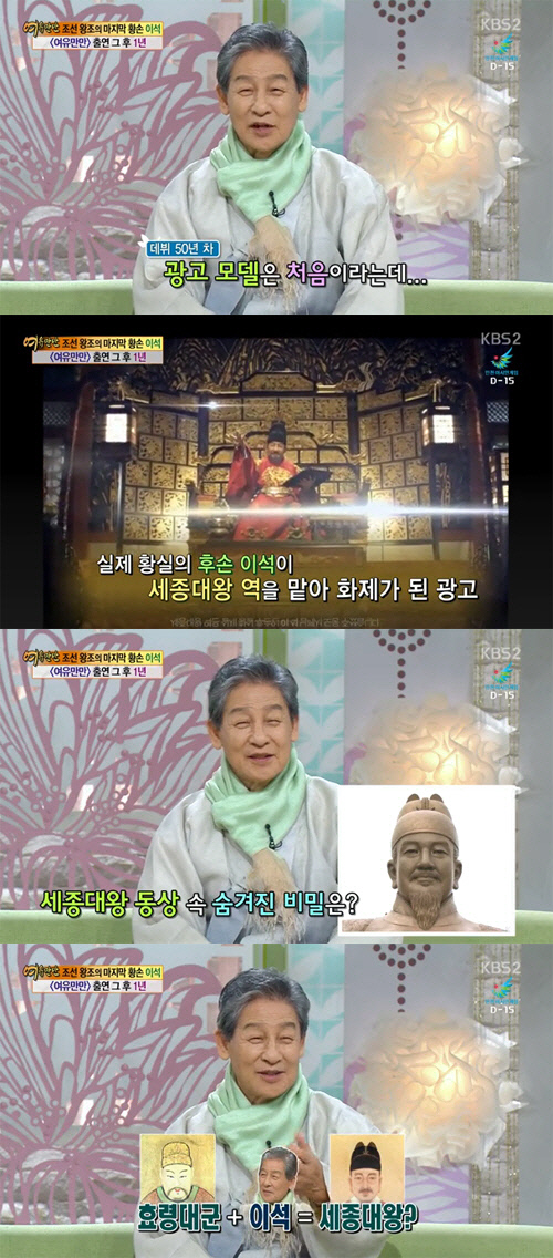 최근 CF를 촬영한 이석은 "연예계 30~40년 있으면서 광고모델은 안 했다. 왕실에서 '진짜 광대가 되려고 하느냐'며 허락하지 않았다"며 "근데 이번 광고는 세종대왕 역을 맡았기 때문에 촬영할 수 있었다"고 말했다. 이어 "촬영 내내 가슴이 뭉클했다"고 소감을 밝혔다.