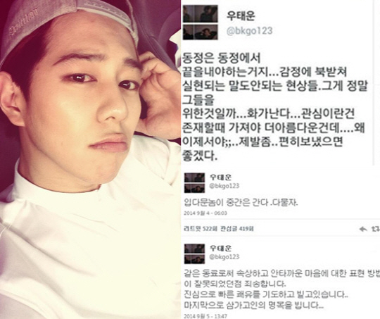 우태운은 5일 자신의 트위터에 "같은 동료로서 속상하고 안타까운 마음에 대한 표현 방법이 잘못되었던 점 죄송합니다"라며 "진심으로 빠른 쾌유를 기도하고 빌고 있습니다. 마지막으로 삼가고인의 명복을 빕니다"고 고개를 숙였다.