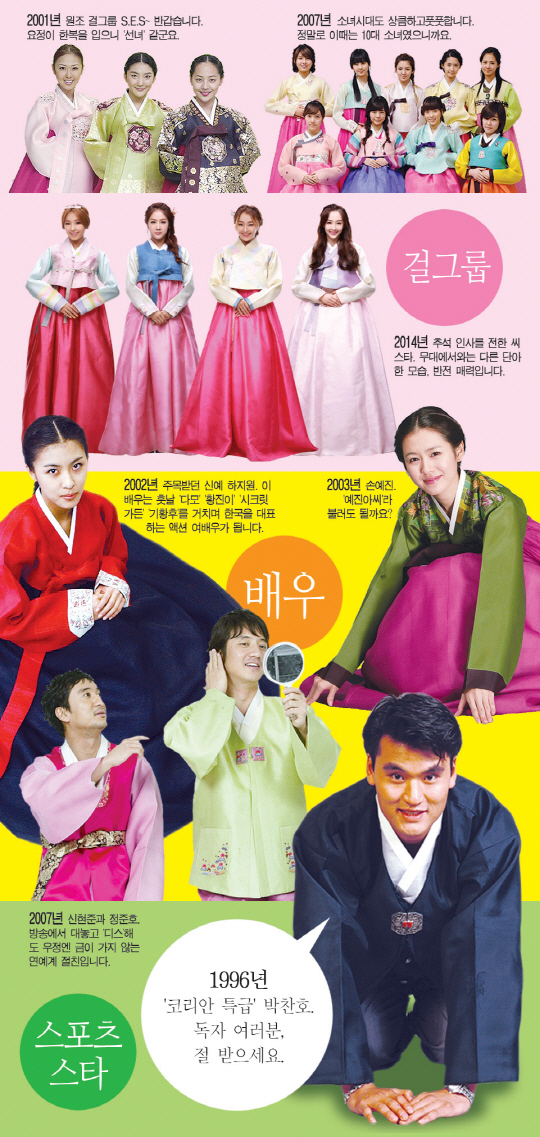 추석 연휴가 시작됐습니다. 38년 만에 찾아온 가장 빠른 추석이라고 합니다. 아직 낮엔 이마에 땀이 송글송글 맺힐 정도로 더운데 말이죠. '철 없는' 추석이긴 하지만, 그래도 명절 분위기 한번 내볼까요. 얼마 전까지만 해도 명절이면 스타들이 한복을 곱게 차려 입고 팬들에게 명절인사를 전하곤 했는데요. 걸그룹부터 톱배우와 스포츠스타까지, 여러 스타들이 한복 차림으로 카메라 앞에 섰습니다. 그중에서 다시 보고 싶은 스타들의 한복 인사를 골라봤습니다. 즐거운 한가위 연휴 보내시길 바랍니다.