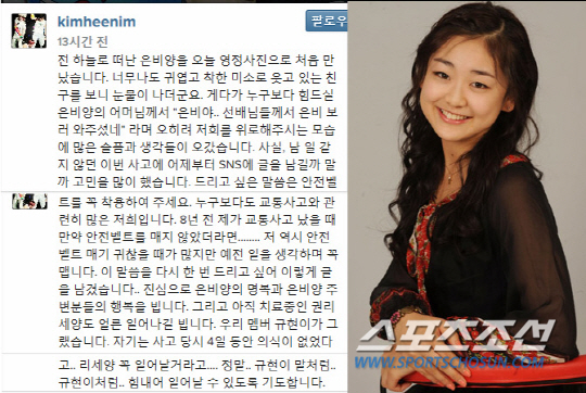 이어 "게다가 누구보다 힘드실 은비양의 어머님께서 '은비야… 선배님들께서 은비 보러 와주셨네'라며 오히려 저희를 위로해주시는 모습에 많은 슬픔과 생각들이 오갔습니다. 사실 남 일 같지 않던 이번 사고에 어제부터 SNS에 글을 남길까 말까 고민을 많이 했습니다. 드리고 싶은 말씀은 안전벨트를 꼭 착용해 주세요. 누구보다도 교통사고와 관련이 많은 저희입니다. 8년 전 제가 교통사고 났을 때 만약 안전벨트를 매지 않았더라면… 저 역시 안전벨트 매기 귀찮을 때가 많지만 예전 일을 생각하며 꼭 맵니다"고 당부했다.