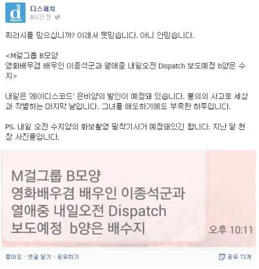 배우 이종석과 걸그룹 미쓰에이 수지가 열애 중임을 디스패치가 보도할 것이라는 소문이 SNS를 통해 확산된 가운데 디스패치가 입장을 밝혔다.