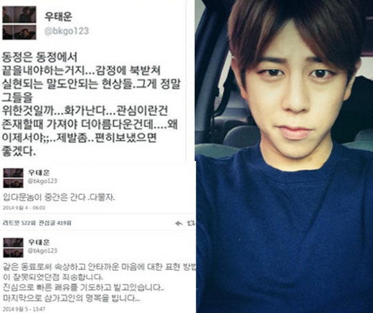 앞선 4일 우태운은 자신의 트웨터에 "동정은 동정에서 끝을 내야 하는 거지. 감정에 북받쳐 실현되는 말도 안 되는 현상들. 그게 정말 그들을 위한 것일까. 화가 난다"라며 "관심이란 건 존재할 때 가져야 더 아름다운 건데 왜 이제야. 제발 좀 편히 보냈으면 좋겠다"라며 내용이 담긴 글을 게재했다.