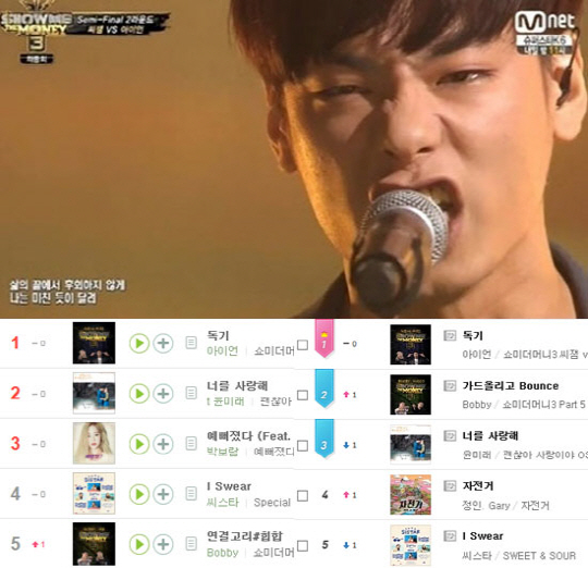방송 이후 공개된 아이언의 '독기'는 5일 엠넷 뮤직·지니·벅스 뮤직·소리바다·네이버 뮤직 총 5개 실시간 음원차트에서 1위를 차지하는 기염을 토했다.
