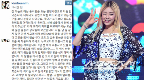 김희철은 "누구보다 힘드실 은비양의 어머님께서 '은비야… 선배님들께서 은비 보러 와주셨네'라며 오히려 저희를 위로해주시는 모습에 많은 슬픔과 생각들이 오갔습니다"며 "사실 남 일 같지 않던 이번 사고에 어제부터 SNS에 글을 남길까 말까 고민을 많이 했습니다. 드리고 싶은 말씀은 안전벨트를 꼭 착용해 주세요. 누구보다도 교통사고와 관련이 많은 저희입니다. 8년 전 제가 교통사고 났을 때 만약 안전벨트를 매지 않았더라면… 저 역시 안전벨트 매기 귀찮을 때가 많지만 예전 일을 생각하며 꼭 맵니다"고 당부했다.